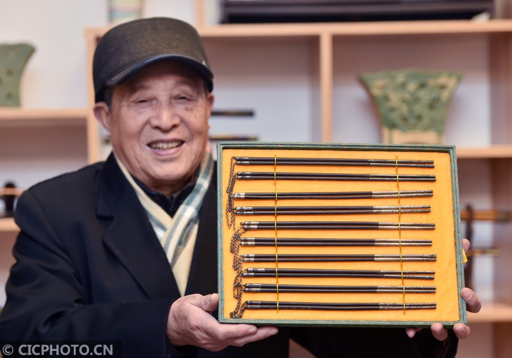 ↑2020年12月24日,在江苏省扬州市汶河街道旌忠寺社区开展的“筷箸文化节”活动上,民间收藏者在展示筷箸文化藏品。CICPHOTO/庄文斌 摄