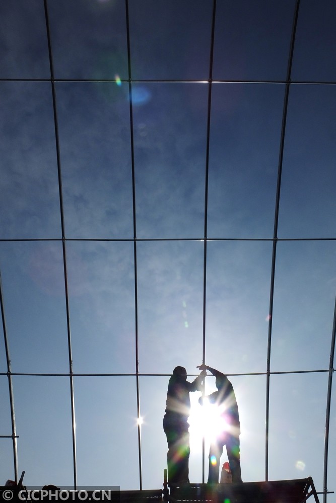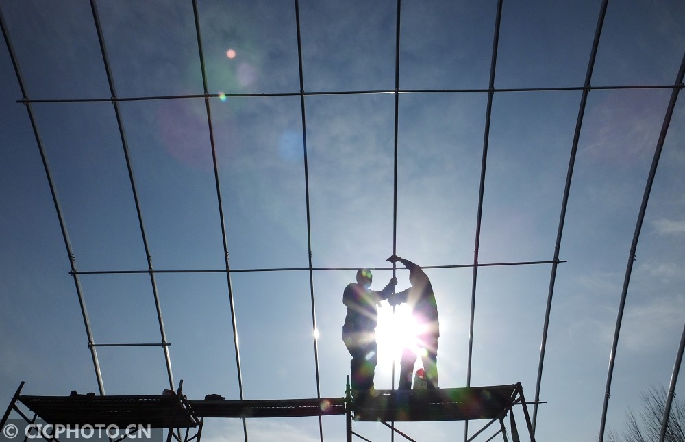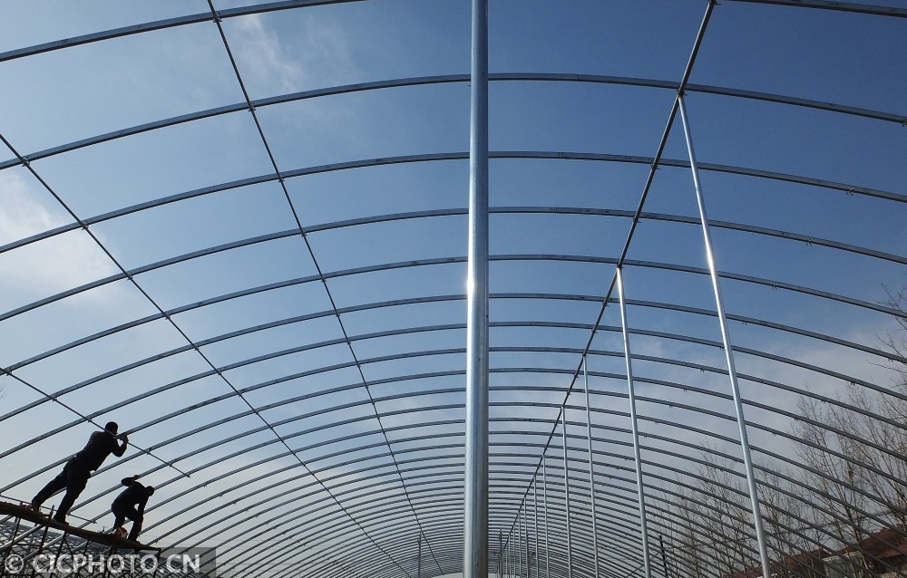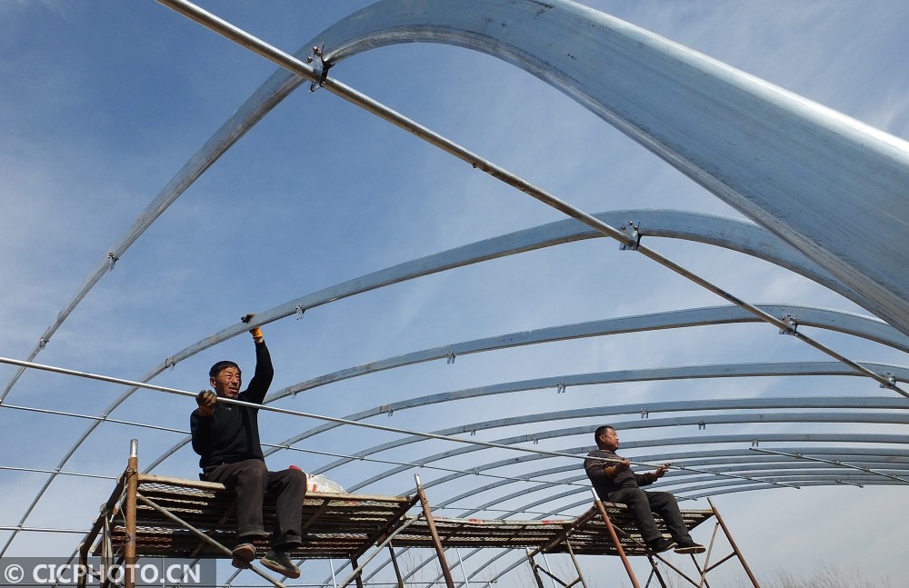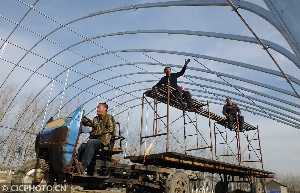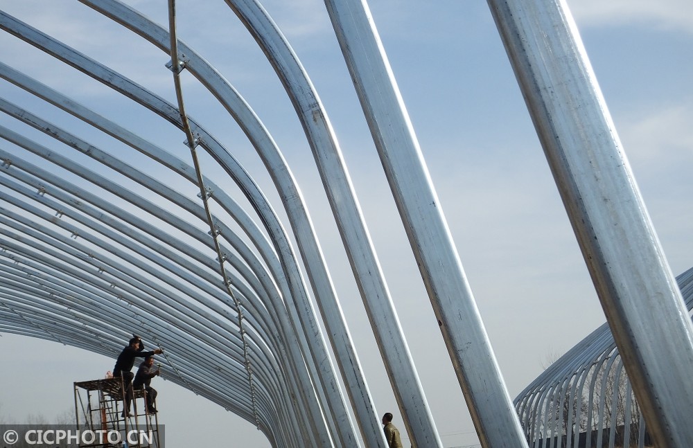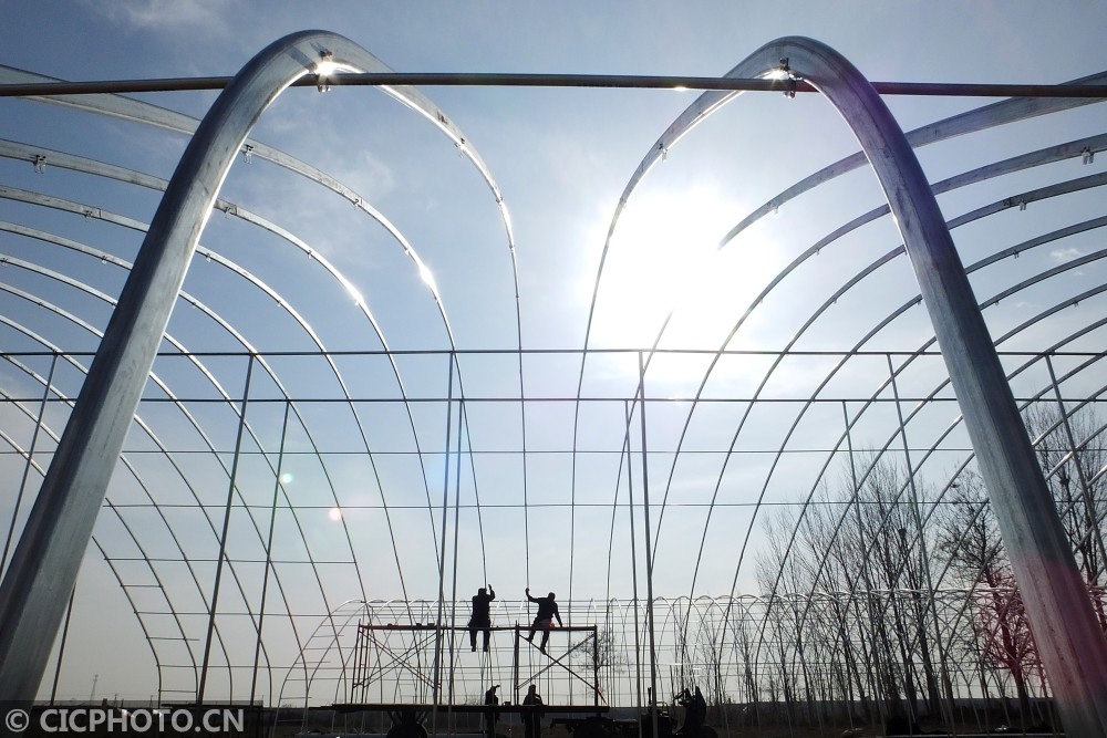 以上图片:2020年12月25日,山西省运城市新绛县泉掌镇王守庄村新建的超大设施蔬菜大棚基地里,菜农们在建设新型超大设施蔬菜大棚。CICPHOTO/高新生 摄