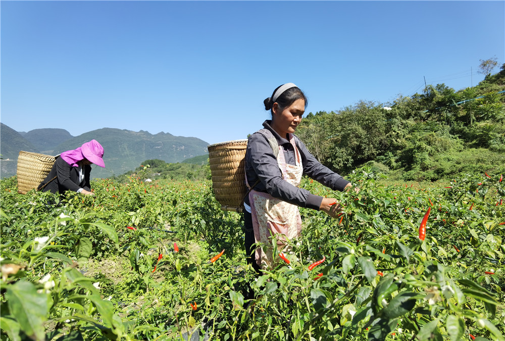 新华社贵阳12月28日电(记者李凡)前不久,乌蒙山深处镰刀湾村500亩辣椒,今冬最后一轮采摘。40岁的村民杨传会一大早就背上竹背篼,娴熟地采下火红的小米椒,手指被染得黢黑,但她对这份工作感到满意。