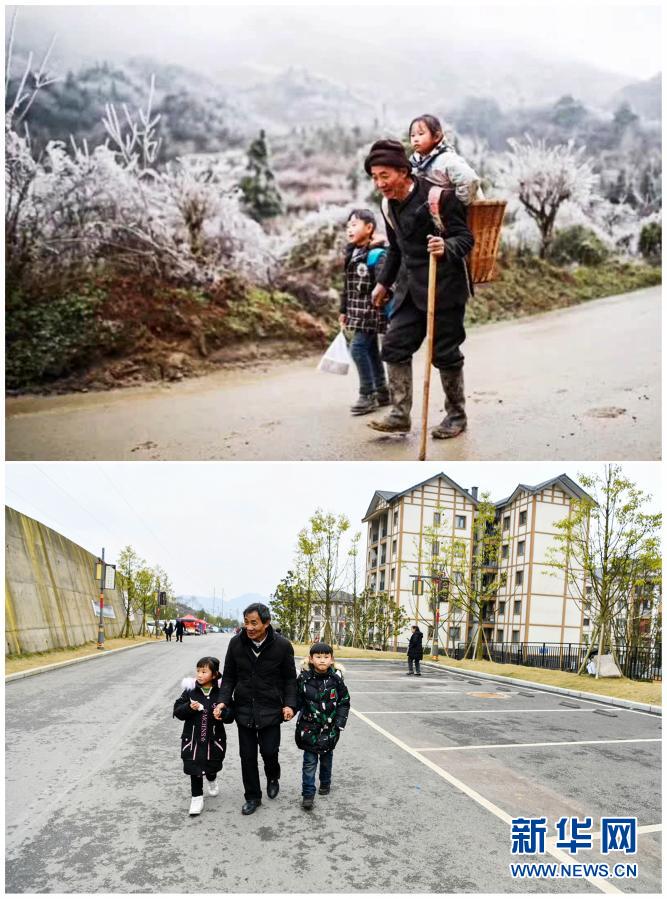 拼版照片:上图为2018年12月13日,在贵州省大方县三元乡河头村,李昌德用背篓背着李青怡、带着李思宇(右三)走在回家的路上;下图为2020年12月23日,在大方县奢香古镇易地扶贫搬迁安置点,李昌德(中)牵着李思宇(右)、李青怡放学归来。新华社记者 杨文斌 摄
