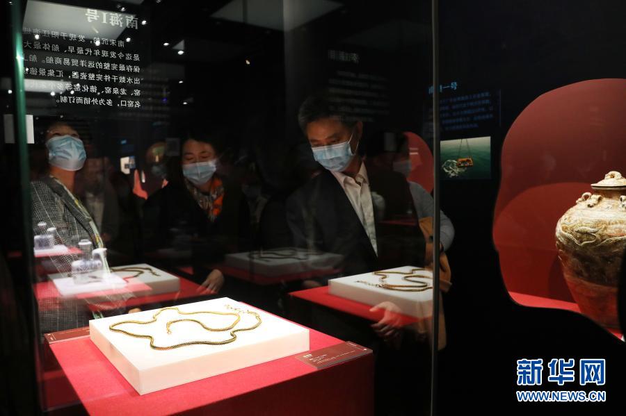 12月28日,参观者在航海文物展上“南海一号”出水的宋代金项饰展柜前驻足观看。