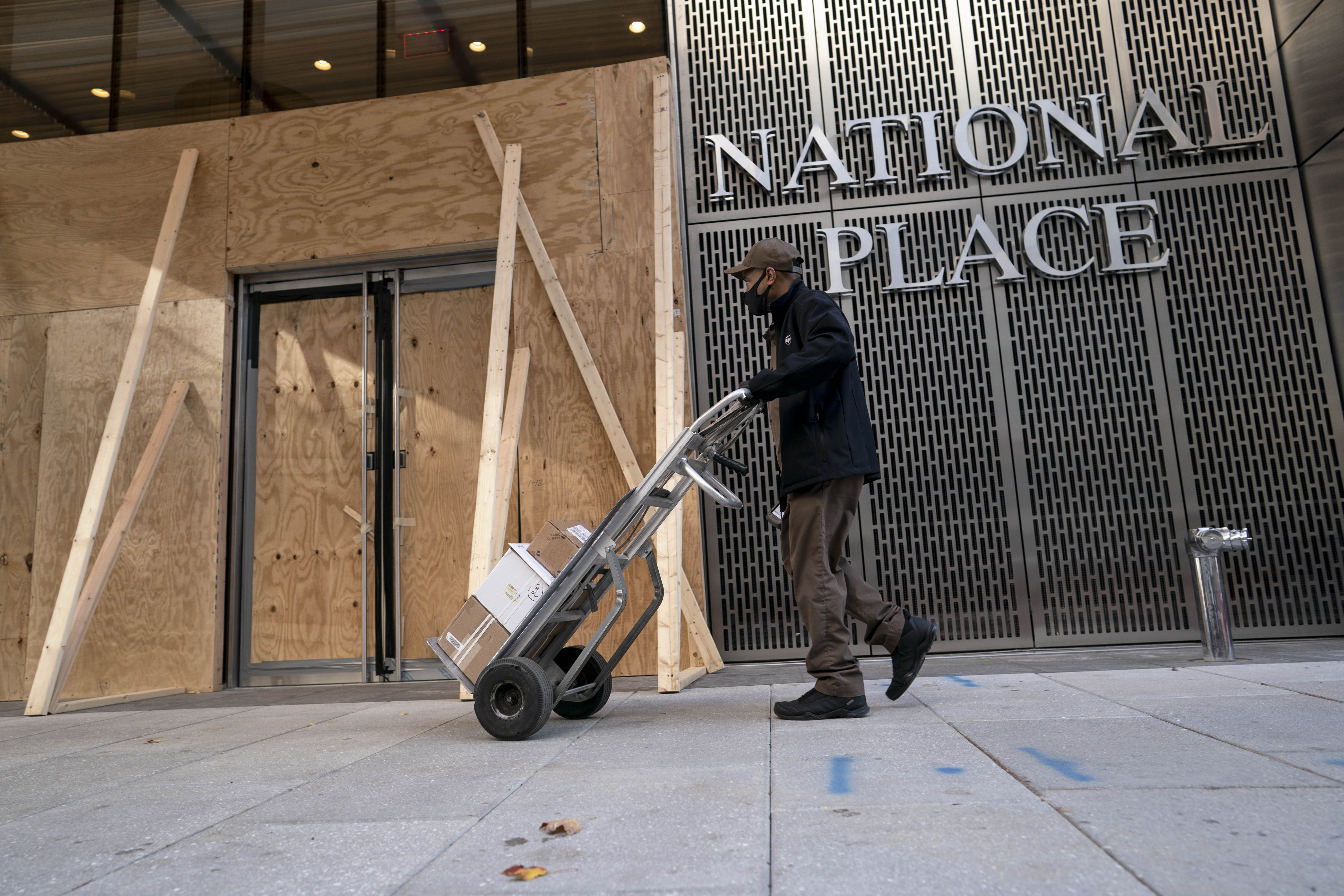 11月19日,美国华盛顿的一名快递员经过一处用木板加固门窗的办公楼。(新华社记者刘杰摄)