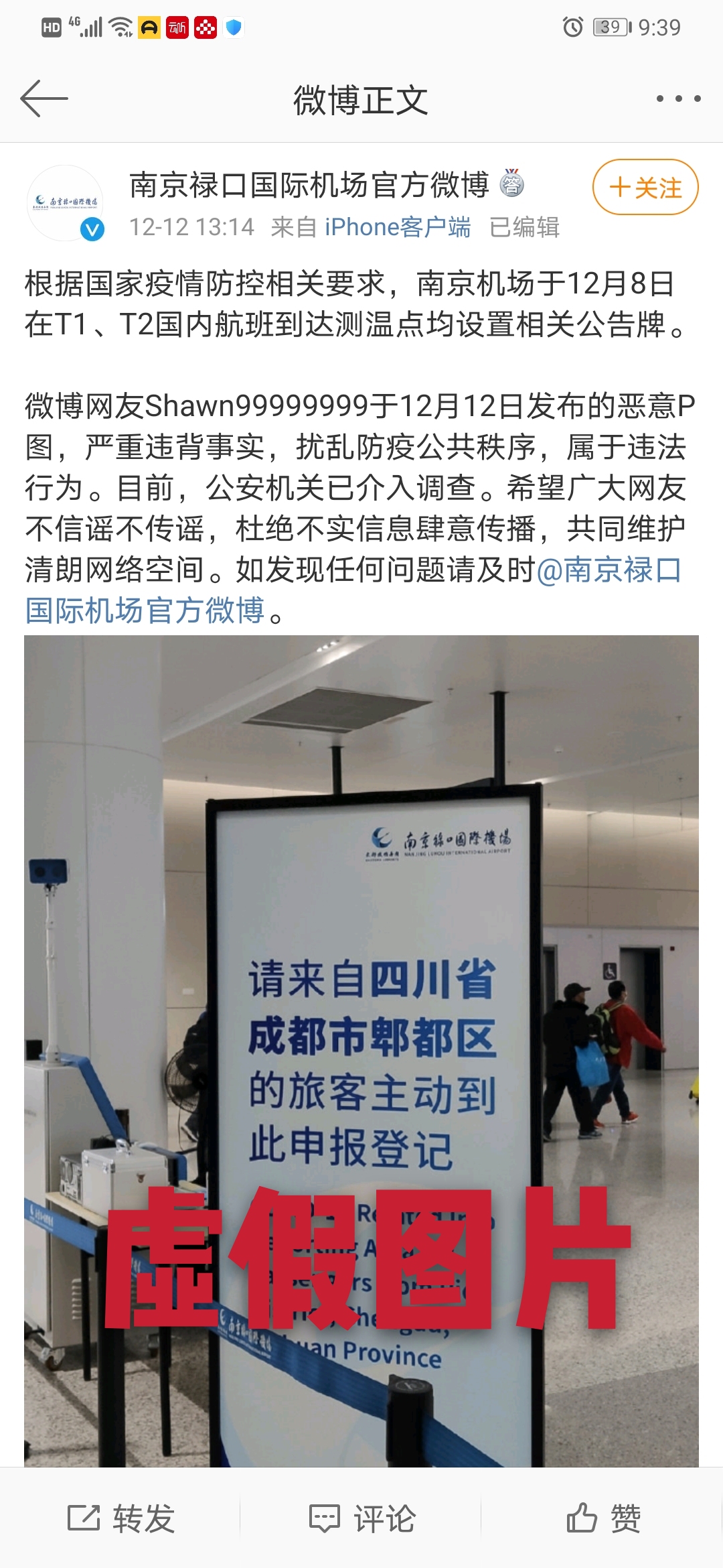据南京禄口国际机场官方微博在12月12日发布的声明称:有网友利用机场设立的指示牌,恶意改图,并造成群众质疑。该行为严重违背事实,扰乱防疫公共秩序,希望广大网友不信谣不传谣。