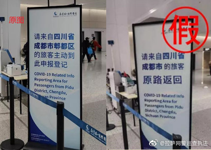 前不久,南京禄口国际机场的疫情防控指示牌遭人恶意篡改,原本是指引四川成都旅客登记的指示牌被改为了“请旅客原路返回”,图片在网络上引发了大量的关注。记者从拉萨公安获悉,涉嫌篡改标牌、散步虚假信息的涉嫌人员已经自首,并接受处罚。