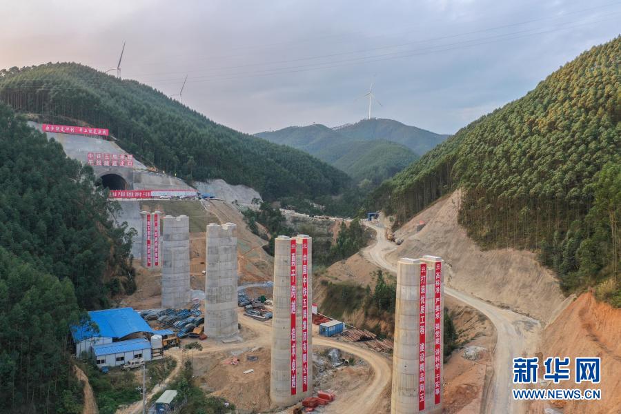 这是12月28日拍摄的南玉高铁6标段平悦隧道和山间桥墩(无人机照片)。
