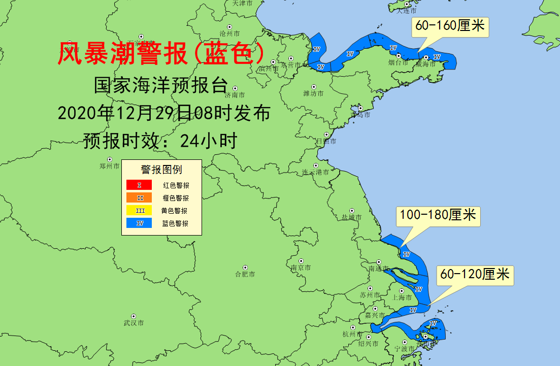 风暴潮蓝色警报。受强冷空气的影响,预计12月29日上午到30日中午,莱州湾和山东半岛北岸将出现60~160厘米的风暴增水,上述岸段内的山东潍坊潮位站将于29日中午出现达到当地蓝色警戒潮位的高潮位;江苏南部沿海将出现100~180厘米的风暴增水,长江口至杭州湾沿海将出现60~120厘米的风暴增水,上述岸段内的浙江镇海潮位站将于30日中午出现达到当地蓝色警戒潮位的高潮位。山东省潍坊市和浙江省宁波市的风暴潮预警级别为蓝色。