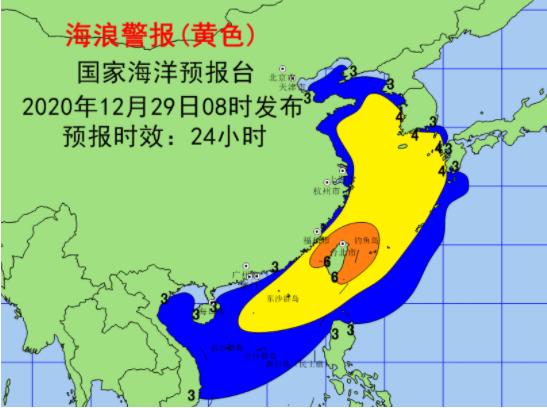 海浪黄色警报。受强冷空气的影响,预计12月29日中午到30日中午,渤海、黄海北部将出现3到4米的大浪到巨浪区,黄海南部、东海北部将出现4到5米的巨浪区,东海南部、钓鱼岛附近海域、台湾海峡将出现4到6米的巨浪到狂浪区,近海海浪预警级别为黄色;辽宁、河北、山东、江苏近岸海域将出现2到3米的中浪到大浪,该近岸海域海浪预警级别为蓝色,上海、浙江、福建近岸海域将出现2.5到3.5米的大浪,该近岸海域海浪预警级别为黄色。