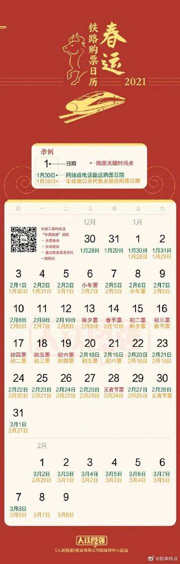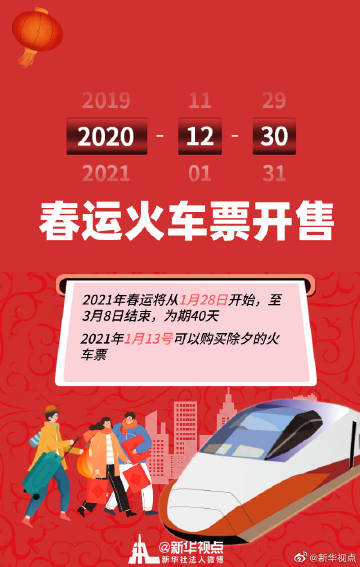 【2021年#春运火车票30日开售#】12月30日,2021年春运火车票正式开始发售。2021年春运将从1月28日开始,至3月8日结束,为期40天。不知道你做好出行计划了吗?说到买票,让小编为你敲重点:1月13日前后可以购买除夕前后的火车票;想安安静静旅行,你可以选择静音车厢;票没抢到,你可以通过“候补购票”功能试试运气。考虑疫情原因,建议有条件的旅客错峰出行,避开春运高峰期,出行时做好防护措施,全程佩戴口罩。(记者樊曦、周圆)
