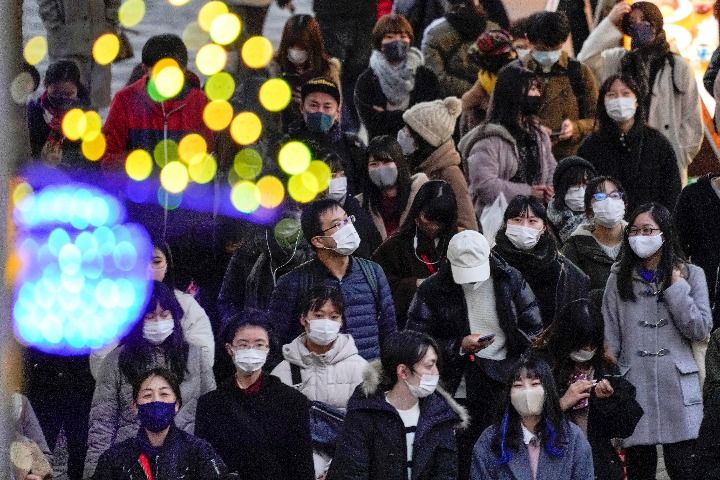 12月26日,在日本东京,人们佩戴口罩上街购物,准备迎接新年。新华社/欧新