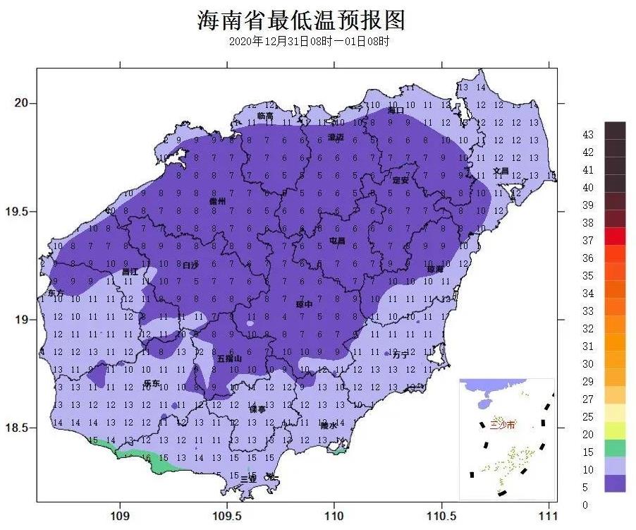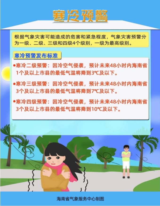 记者从海南省气象部门获悉,2020年12月29日夜间至2021年1月3日,受强冷空气影响,海南将出现强降温和海上大风天气过程,过程平均气温降幅将达10~13℃。2020年12月31日夜间海南各地温度将降至今年最低,北部、西部和中部地区最低气温可降至5~9℃。海南省气象局2020年12月29日10时10分发布寒冷三级预警:受强冷空气影响,海南岛将出现持续低温天气过程,预计31日夜间,澄迈、临高、定安、屯昌、琼中、五指山、白沙、儋州8个市县的部分乡镇最低气温将降至7℃及以下,请有关部门做好防寒工作。