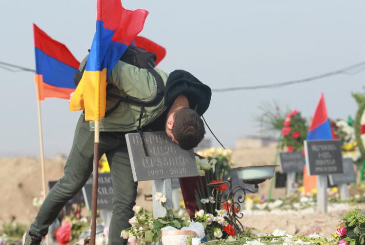 资料图片:在亚美尼亚首都埃里温一处公墓,当地民众安葬在纳卡冲突中阵亡的士兵