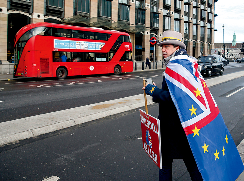 12月9日,反对“脱欧”的示威者站在英国伦敦议会大厦外 韩岩摄/本刊