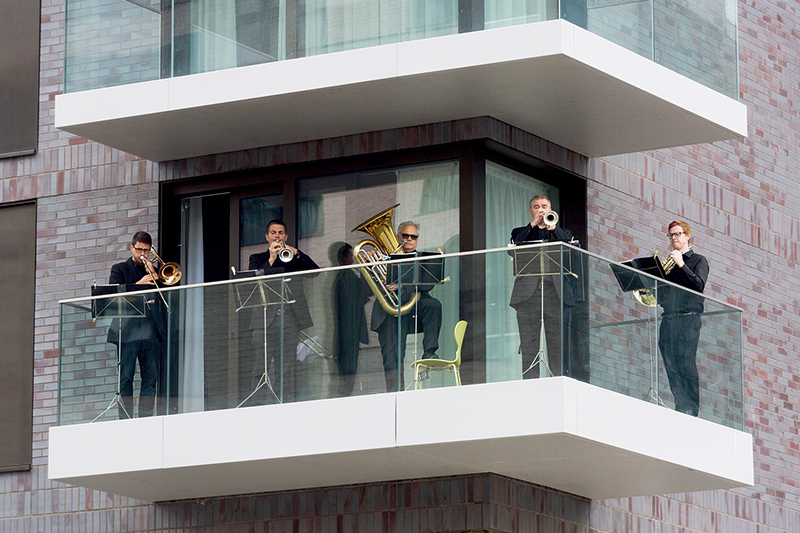9月5日,英国伦敦温布利公园布雷顿楼阳台上,英国皇家爱乐乐团成员在演奏,为附近街区的居民和参观者带来一场精彩演出。为保持社交距离,乐团成员以小乐团的形式在户外为人们演奏音乐