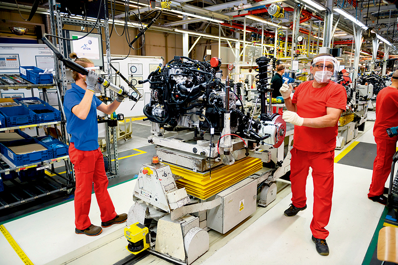 4月27日,波兰波兹南,大众汽车工厂的工人戴着口罩在车间工作