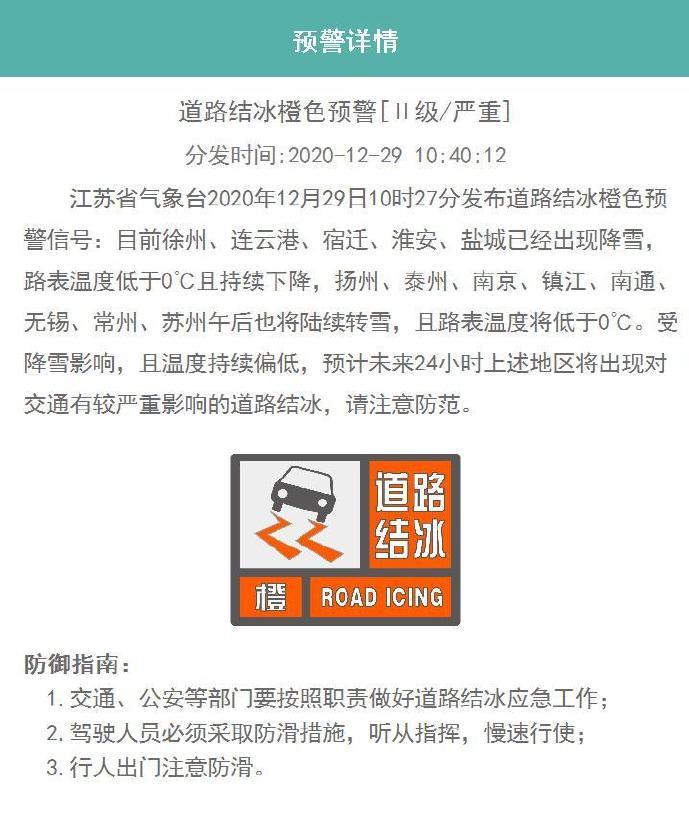 江苏省气象台2020年12月29日10时27分发布道路结冰橙色预警信号: