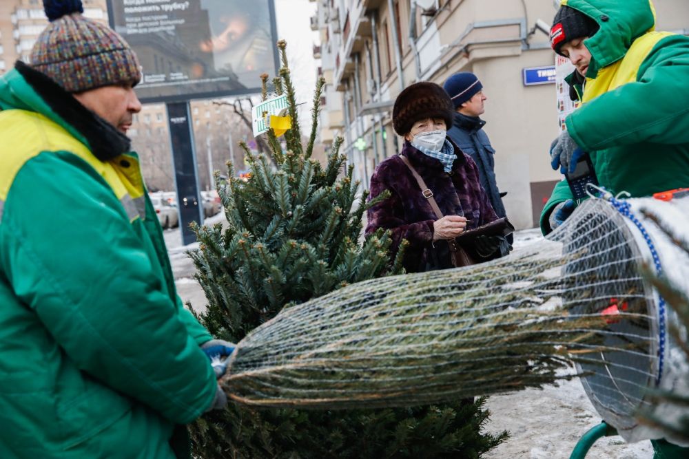12月27日,商贩在俄罗斯首都莫斯科的节日市场包装新年枞树。(新华社发,马克西姆·切尔纳夫斯基摄)