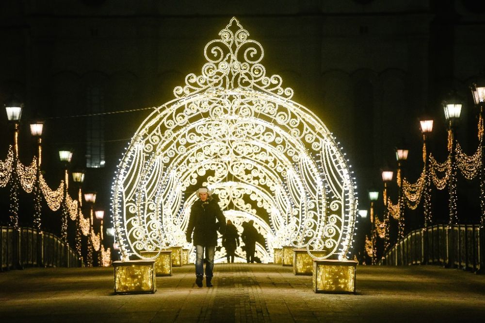 12月23日,在俄罗斯首都莫斯科,人们走过装饰有新年灯饰的通道。(新华社发,叶甫盖尼·西尼岑摄)