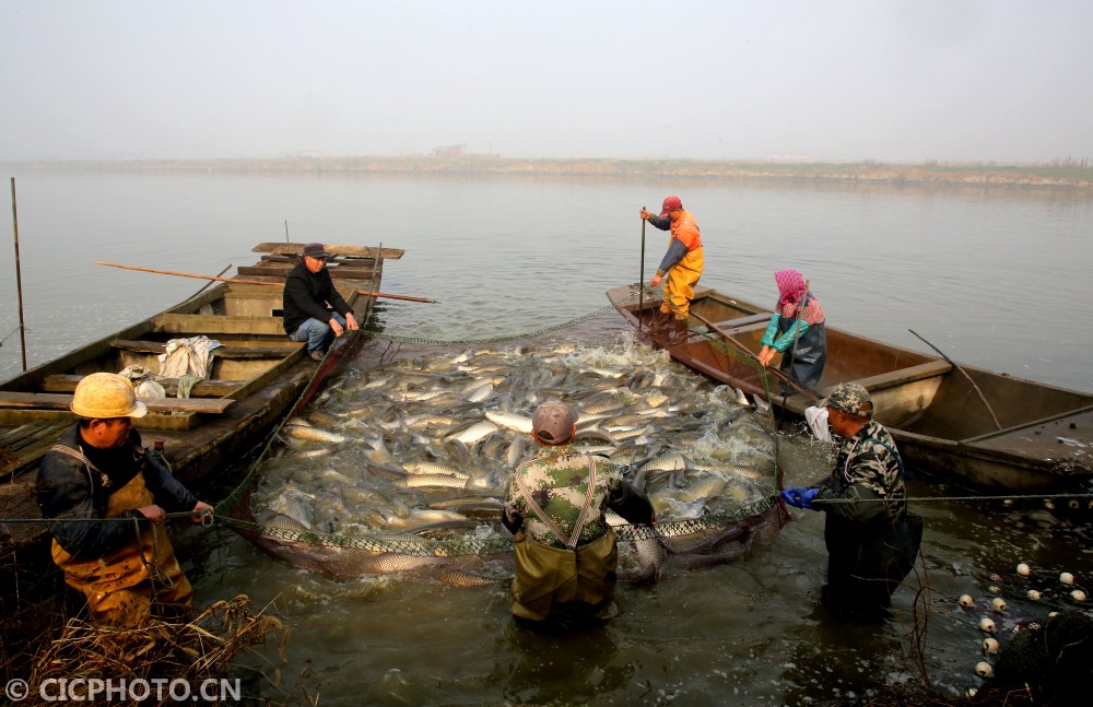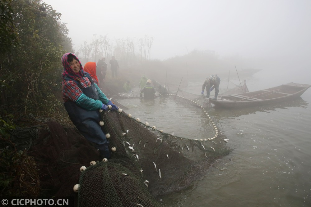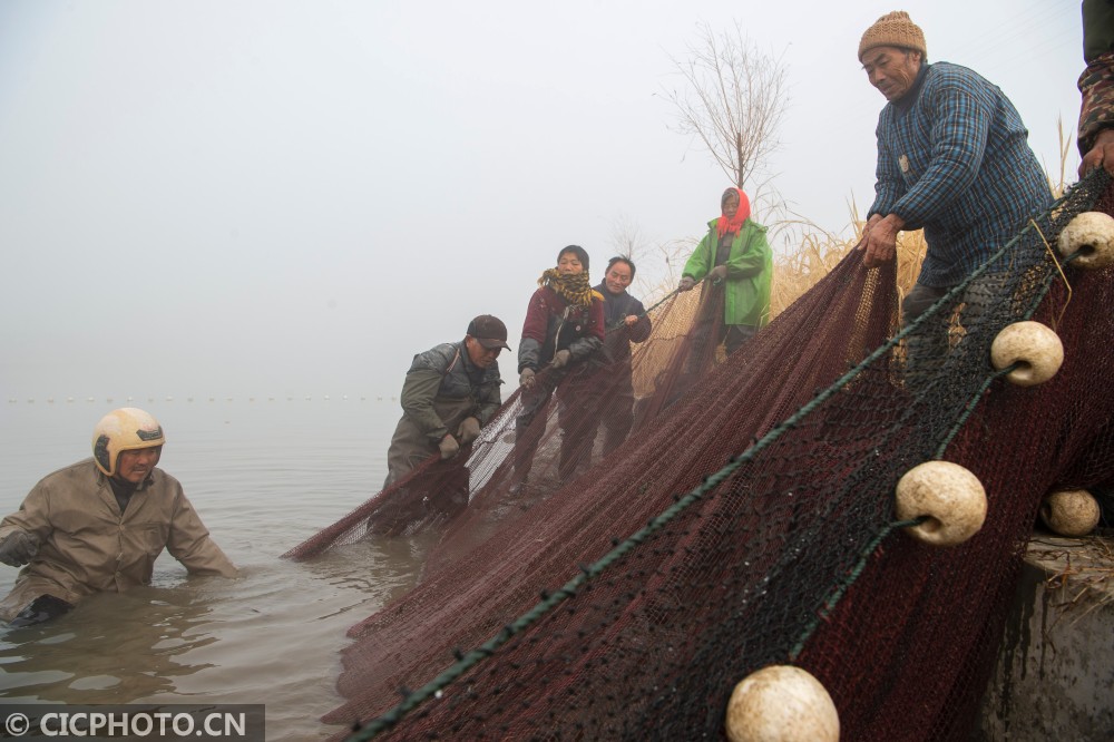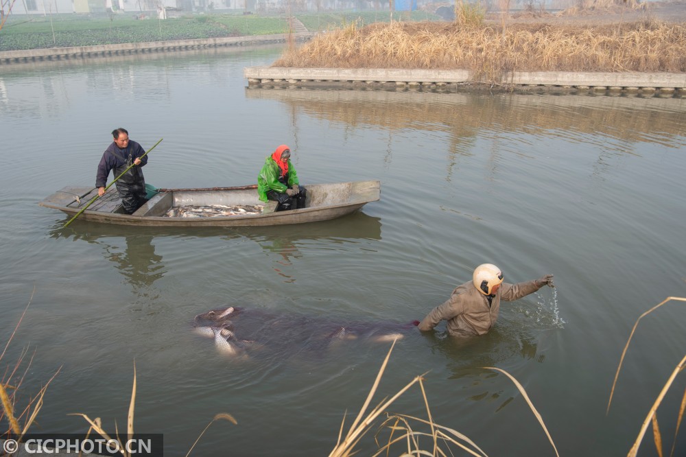 ↑2020年12月28日,在江苏省东台市溱东镇草舍村,渔民在拉网捕鱼。CICPHOTO/顾俊 摄