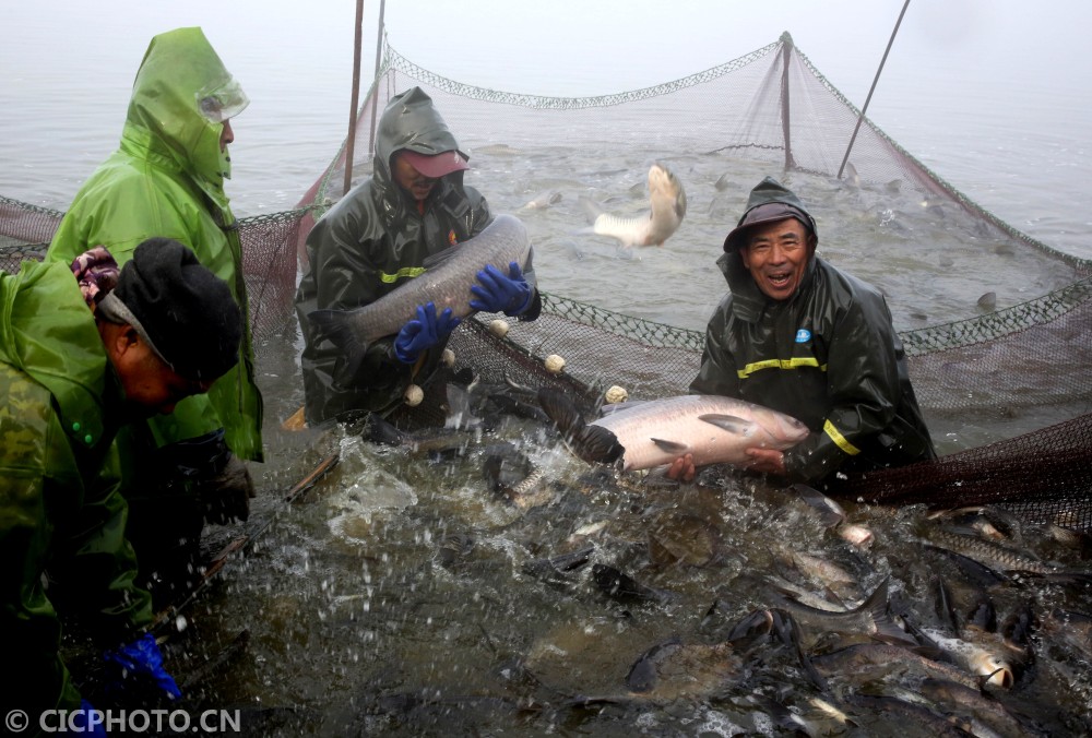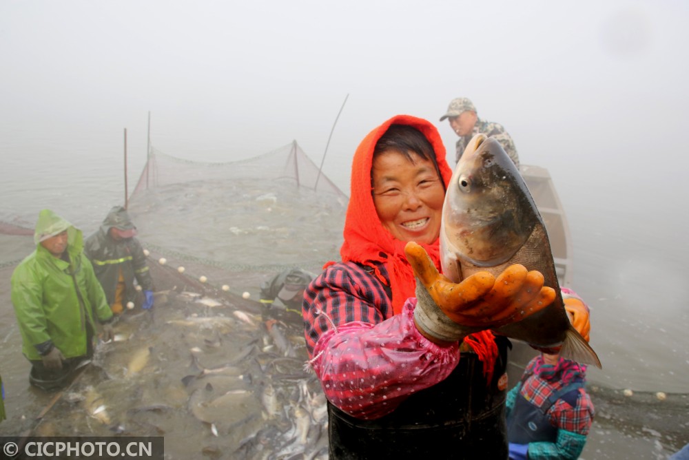↑2020年12月28日,在江苏省海安市白甸镇周垛村,村民将捕捞上来的鲜鱼运上岸。CICPHOTO/徐劲柏 摄