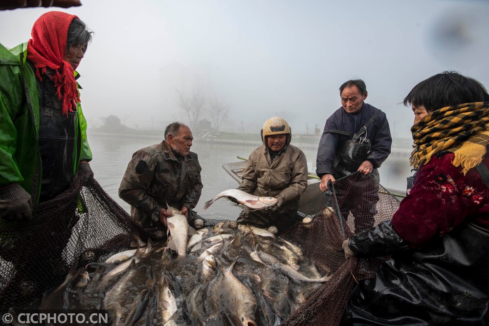 ↑2020年12月28日,在江苏省海安市白甸镇周垛村,村民在对捕捞的鲜鱼进行分拣。CICPHOTO/徐劲柏 摄
