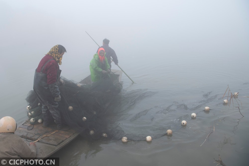 ↑2020年12月28日,在江苏省海安市白甸镇周垛村,当地村民在进行捕鱼作业。CICPHOTO/徐劲柏 摄