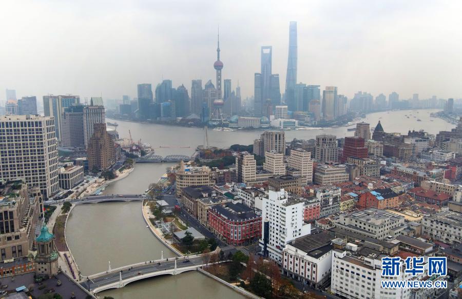 12月29日,从空中俯瞰苏州河(下)从城市楼群中穿过(无人机全景照片)。新华社记者 方喆 摄