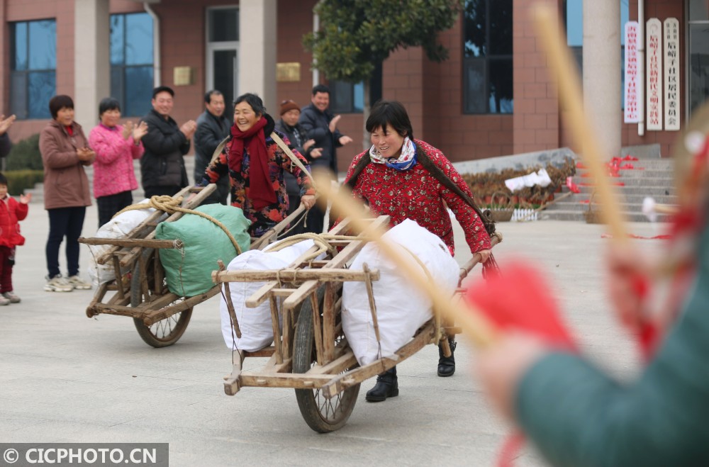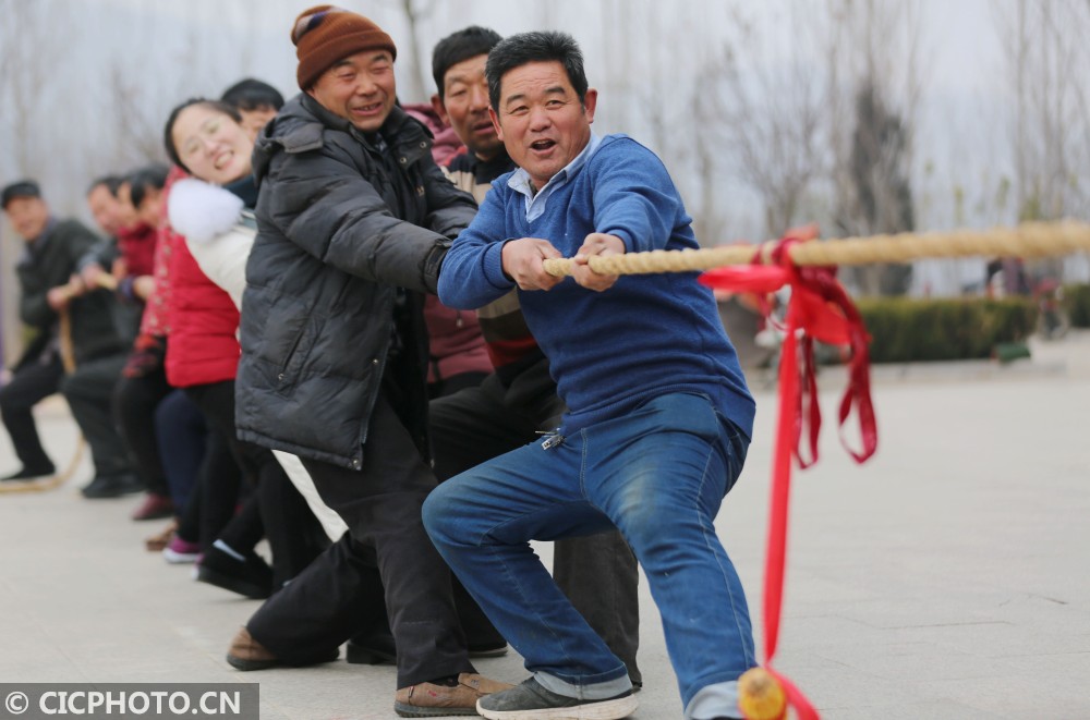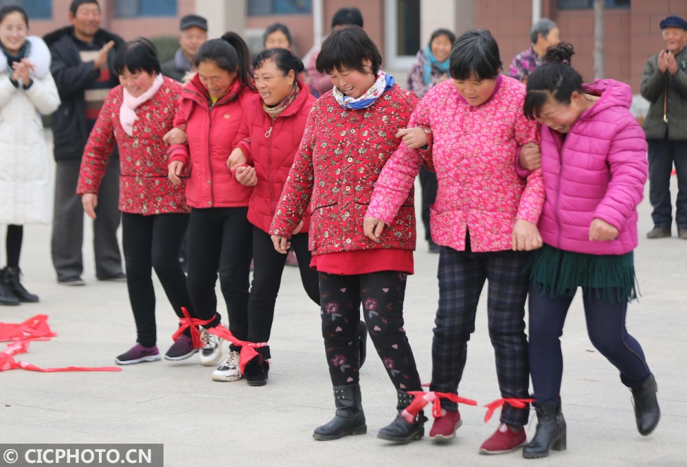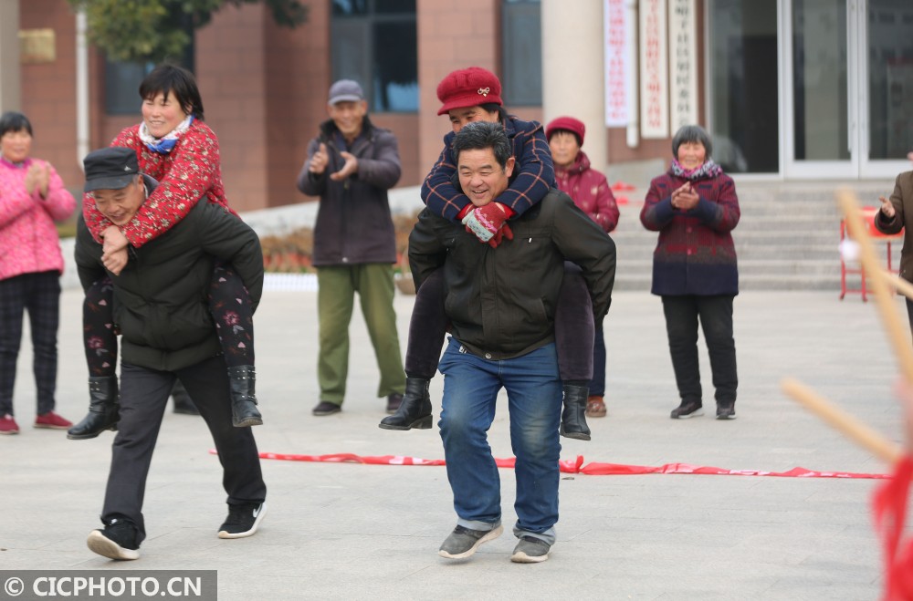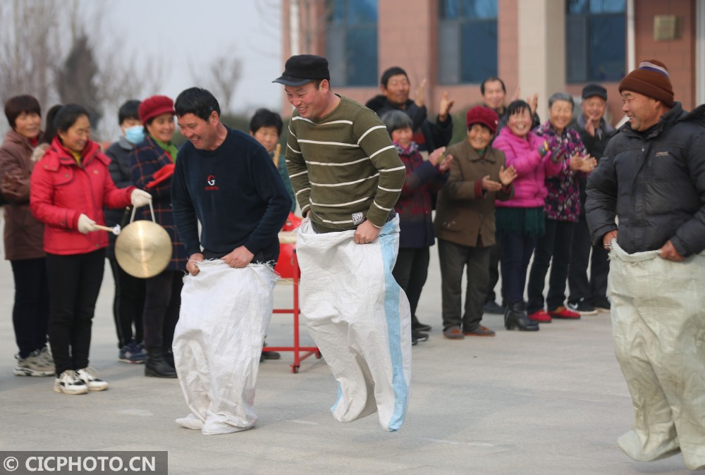 当日,山东省临沂市沂南县依汶镇后峪子社区举办农民趣味运动会,全村120多位村民参加了拔河、扛粮食、三人两足走、背媳妇跑等趣味项目比赛,在运动中迎接新年的到来。