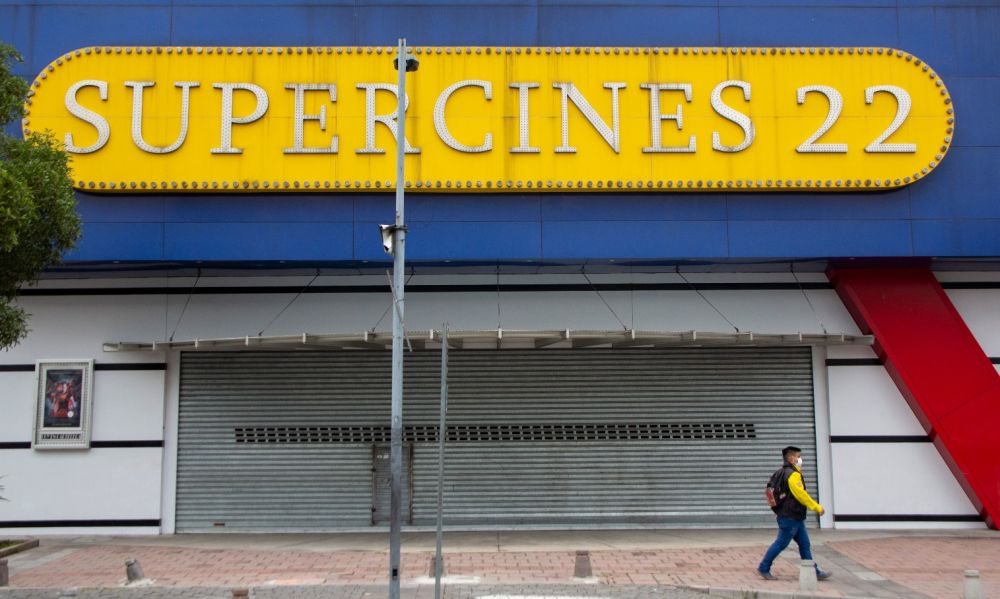 3月17日,在厄瓜多尔首都基多,一名戴口罩的行人走过一家关闭的电影院。(新华社发,圣地亚哥·阿马斯摄)