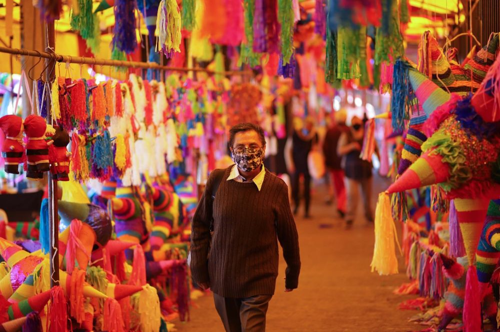 12月18日,在墨西哥首都墨西哥城,一名男子走过一处售卖圣诞节用品的商铺。(新华社发,森尼·金特罗摄)