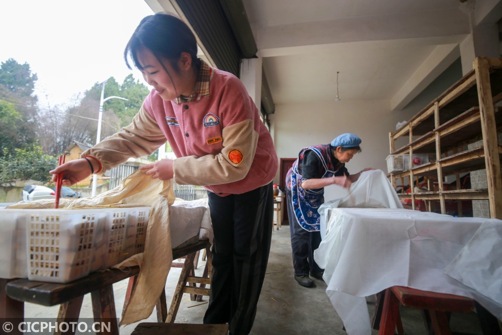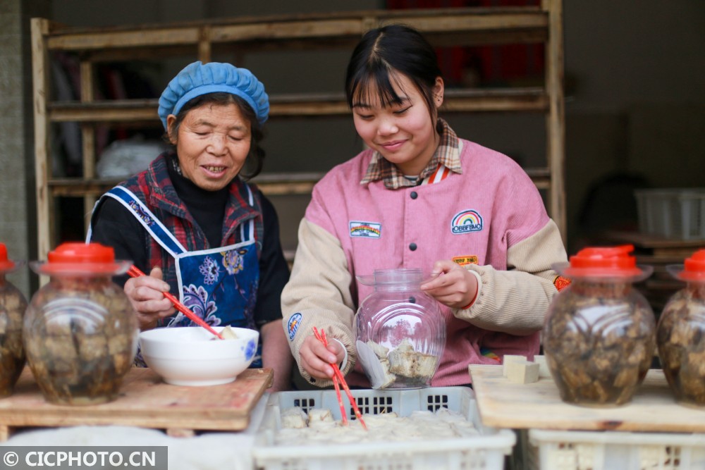 ↑2020年12月28日,贵州省毕节市黔西县雨朵镇扯泥社区村民在检查制作的“霉豆腐”。CICPHOTO/周训超 摄