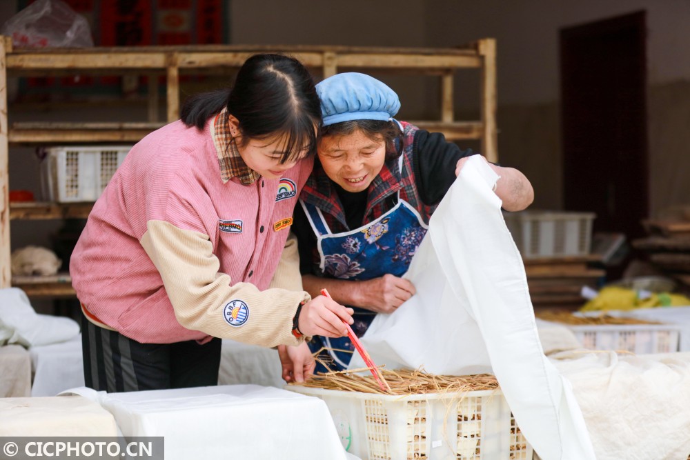 ↑2020年12月28日,贵州省毕节市黔西县雨朵镇扯泥社区村民将“霉豆腐”沾五香面装瓶。CICPHOTO/周训超 摄