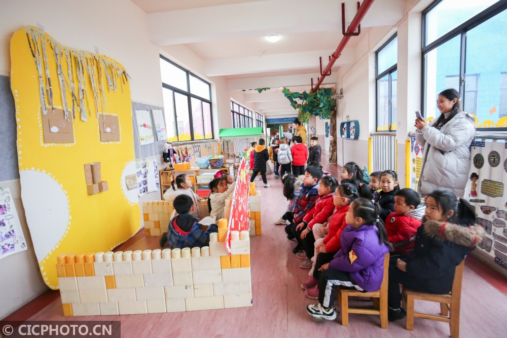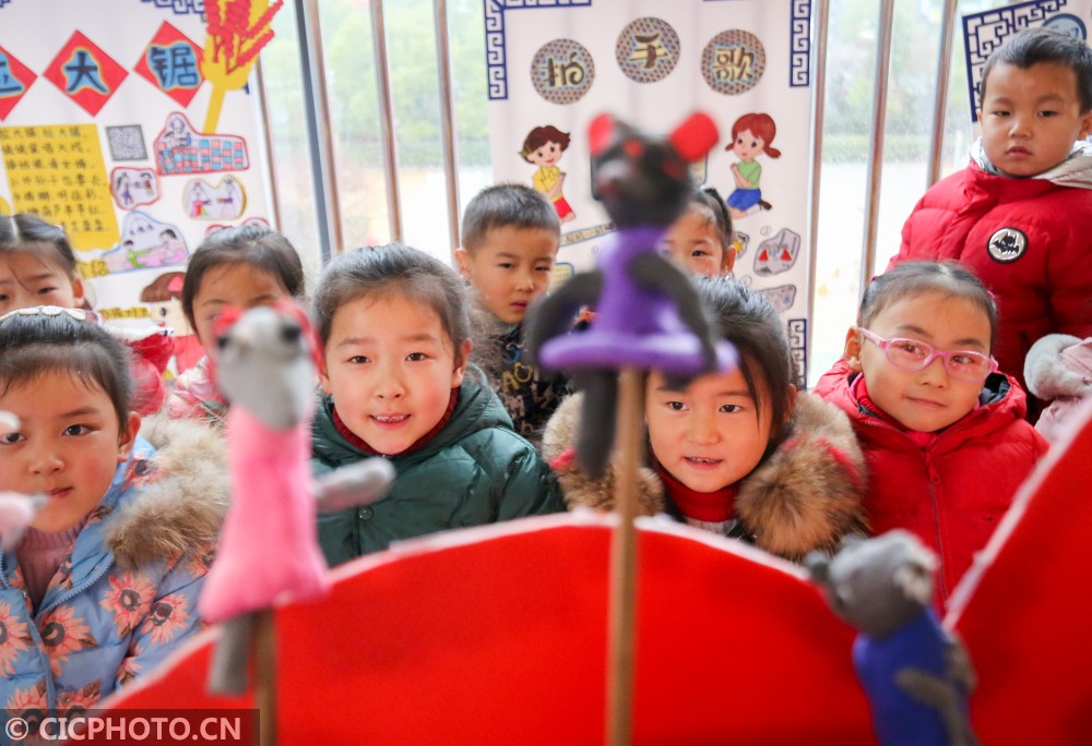 ↑2020年12月29日,在江苏如皋经济技术开发区实验幼儿园,小朋友在观看木偶剧表演。CICPHOTO/徐慧 摄