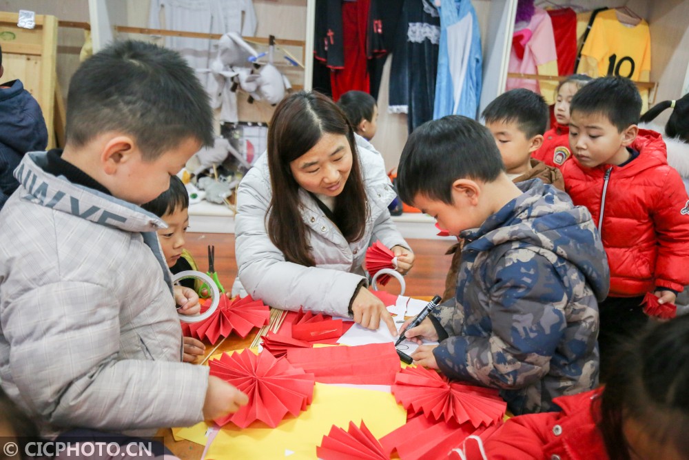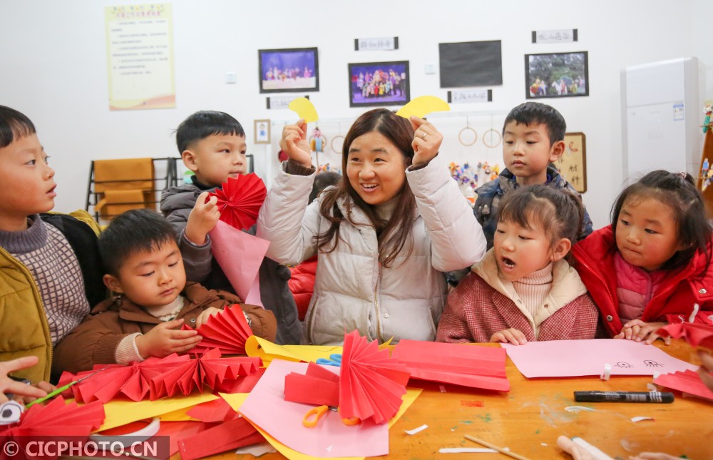 ↑2020年12月29日,在江苏如皋经济技术开发区实验幼儿园,小朋友在学习制作小“牛”偶。CICPHOTO/徐慧 摄