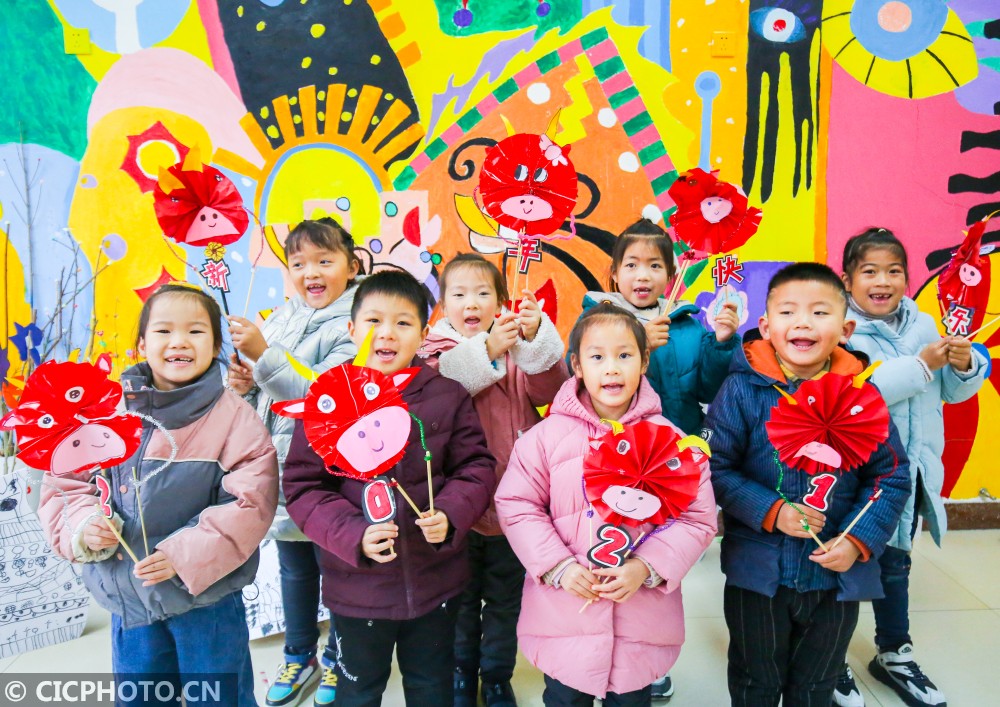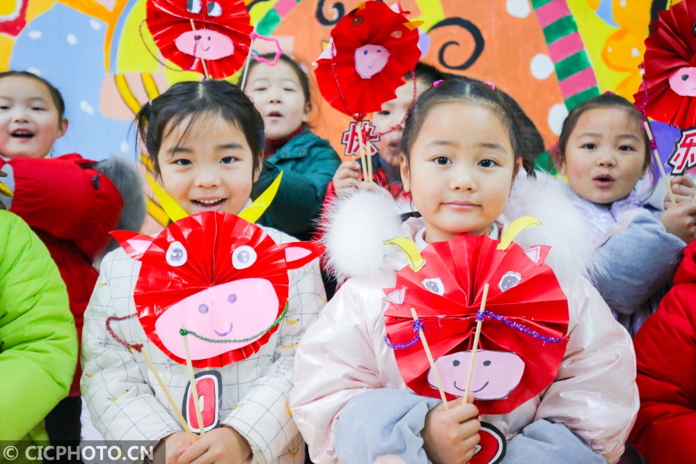 ↑2020年12月29日,在江苏如皋经济技术开发区实验幼儿园,小朋友手拿制作的小“牛”偶送新年祝福。CICPHOTO/徐慧 摄