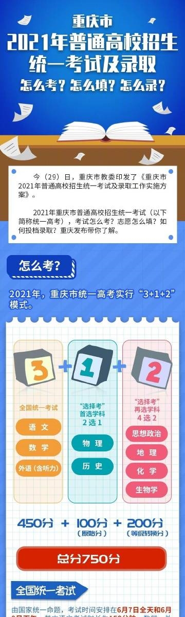 据介绍,2021年重庆市普通高考实行“3+1+2”模式,“3”指全国统一考试语文、数学、外语(含听力)3科;“1”指普通高中学业水平选择性考试首选科目1科;“2”指普通高中学业水平选择性考试再选科目2科。在普通高中学业水平选择性考试中,物理、历史为首选科目,考生只能且必须选择其中1科报考;思想政治、地理、化学、生物学4科为再选科目,考生只能且必须选择其中2科报考。其中,全国统一考试科目语文、数学、外语的分值均为150分,总分450分;学业水平选择性考试每科原始分值均为100分,首选科目成绩以原始分计入总成绩、再选科目成绩以等级转换分(每科满分仍为100分)计入总成绩,总分300分。