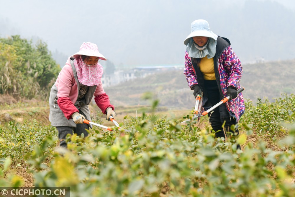 ↑2020年12月26日,重庆市酉阳土家族苗族自治县龙潭镇柏香村村民在油茶育苗基地为油茶苗剪枝。CICPHOTO/冉川 摄