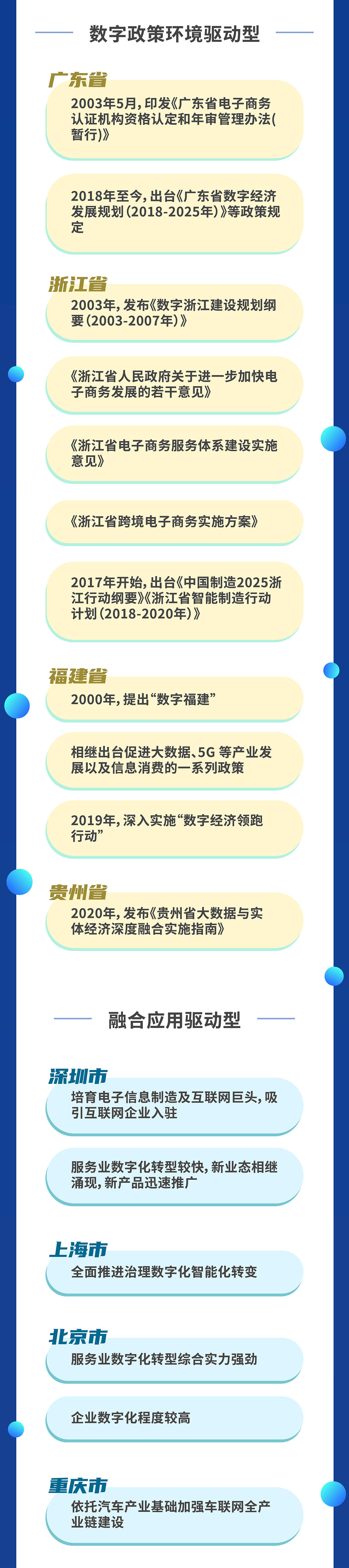 报告选取广东省、浙江省和福建省分别作为数字产业基础、数字融合应用和数字经济政策引领方面的区域发展样板,为各地发展数字经济提供广泛思路。