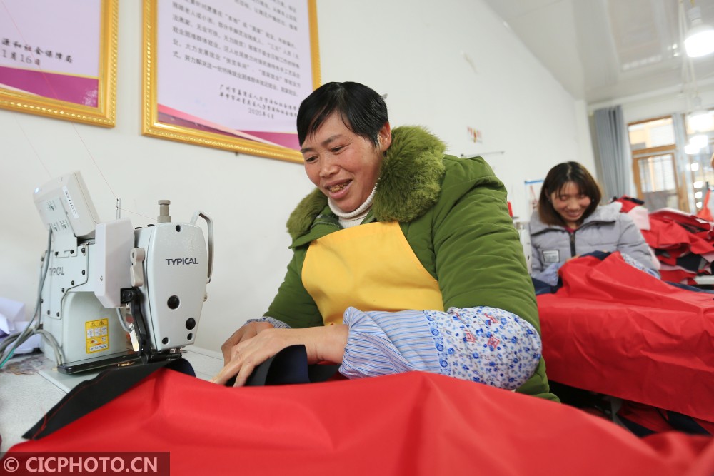 ↑2020年12月26日,贵州省毕节市七星关区柏杨林街道易地扶贫搬迁安置点一就业扶贫车间内,工人在服装生产线上作业。CICPHOTO/王纯亮 摄