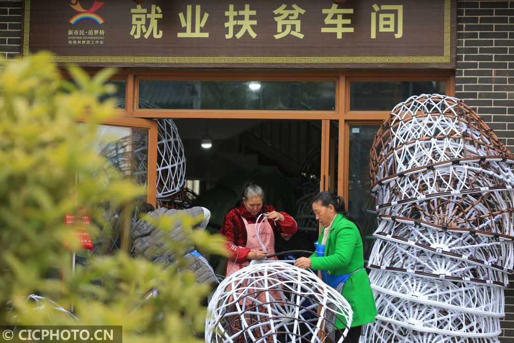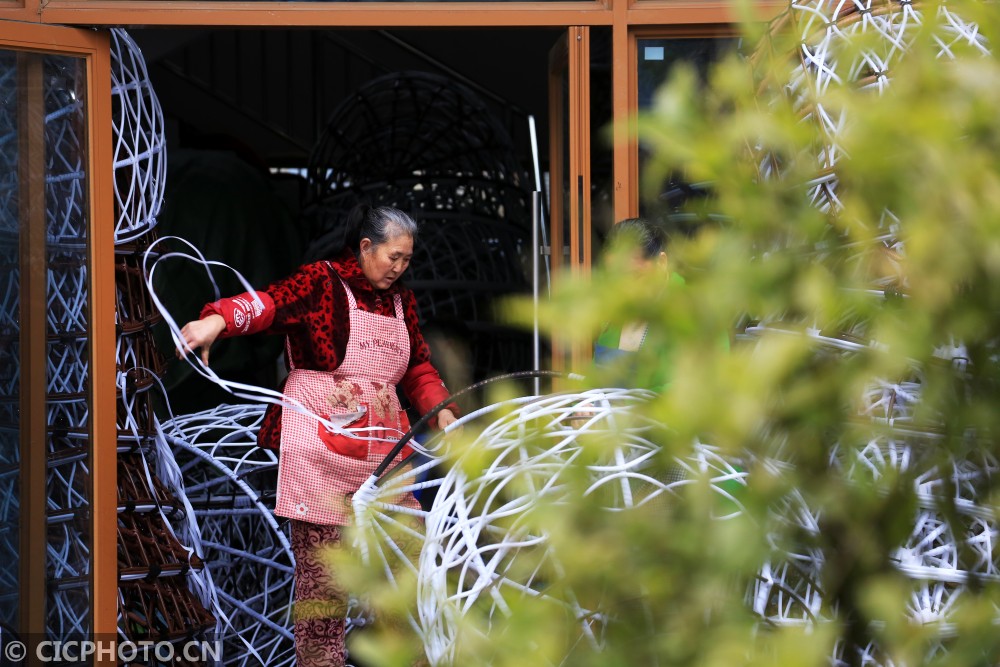 ↑2020年12月26日,贵州省毕节市七星关区柏杨林街道易地扶贫搬迁安置点一就业扶贫车间内,工人在编制吊篮。CICPHOTO/王纯亮 摄