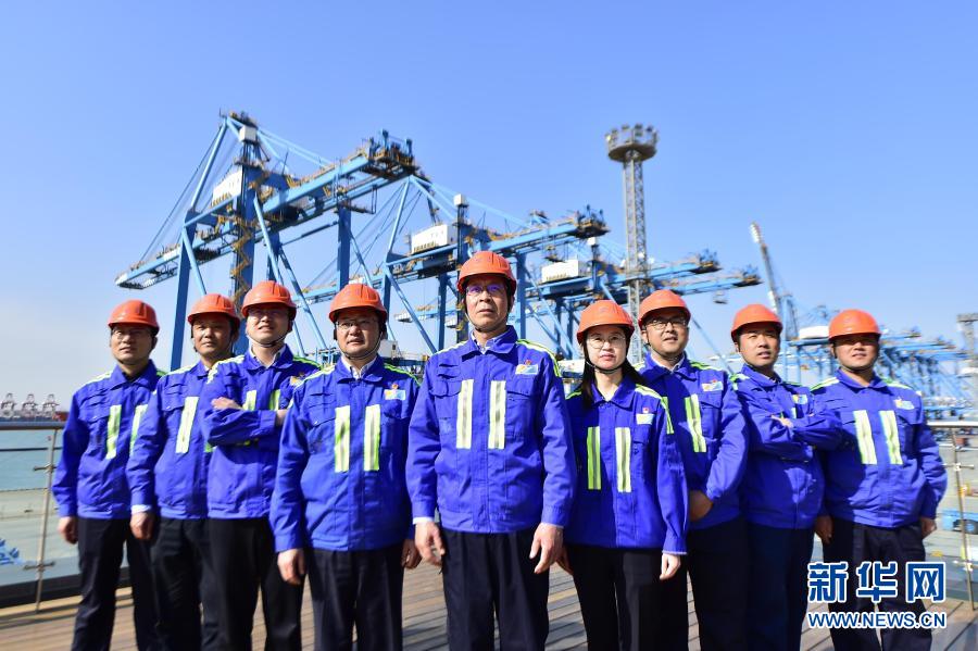 “连钢创新团队”成员在山东港口青岛港自动化码头上(3月28日摄)。