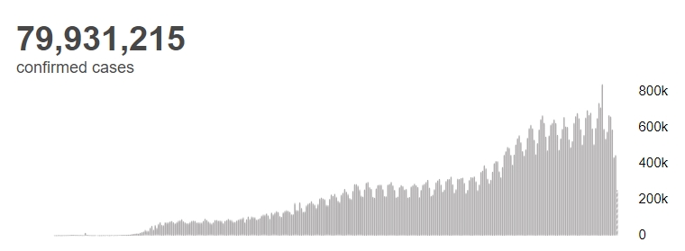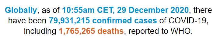 根据世卫组织最新实时统计数据,截至欧洲中部时间12月29日10时55分(北京时间12月29日17时55分),全球累计新冠肺炎确诊病例79931215例,累计死亡病例1765265例。