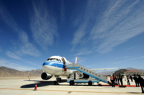 2010年10月30日,中国国际航空公司一架空客A319试飞飞机平稳降落在西藏日喀则机场,西藏第五个民用机场正式通航。新华社记者 觉果 摄