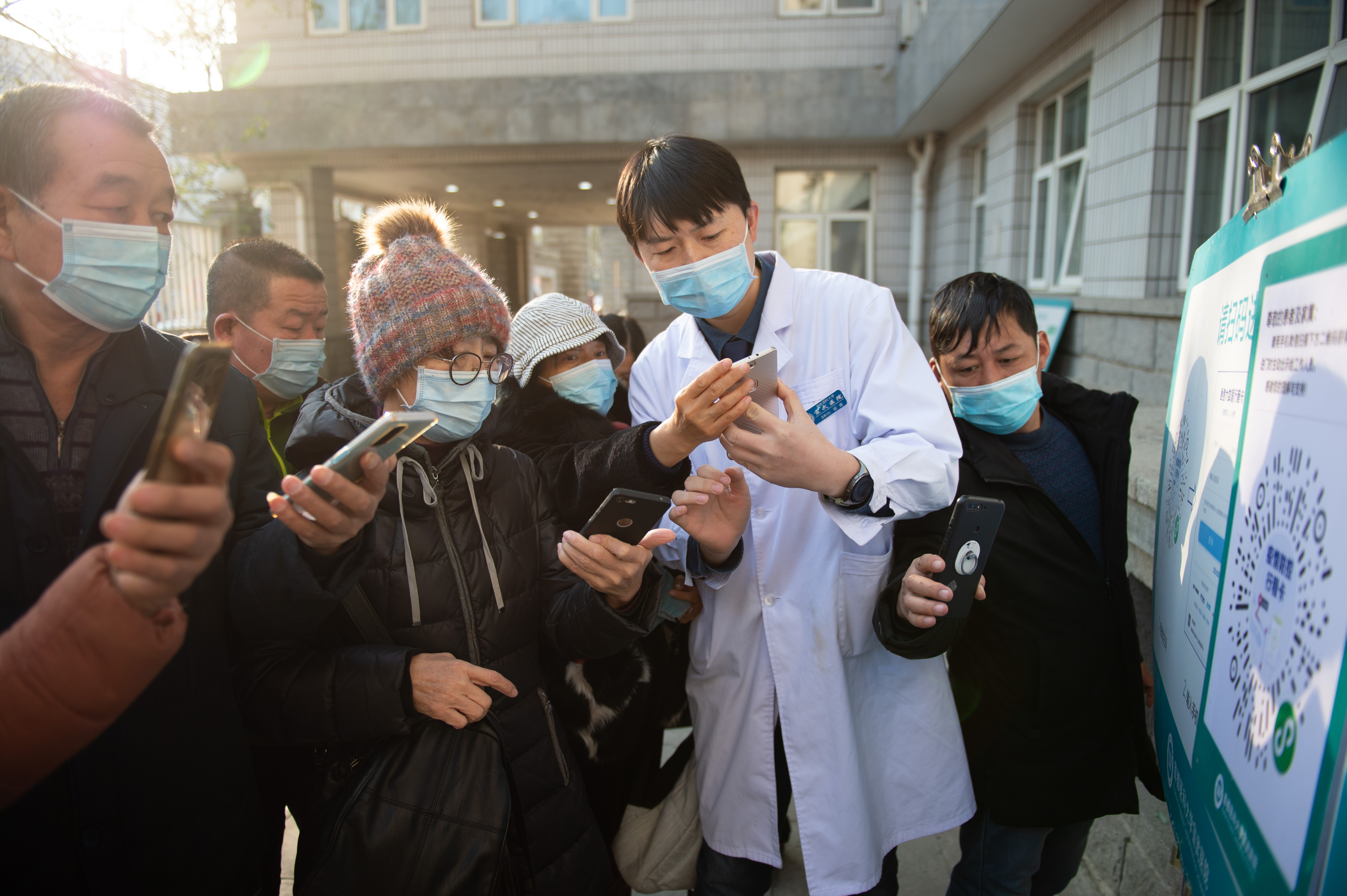 12月10日,在首都医科大学附属宣武医院门诊楼前,工作人员(右二)在帮助老年人用手机扫描“行程卡”二维码。新华社记者 陈钟昊 摄
