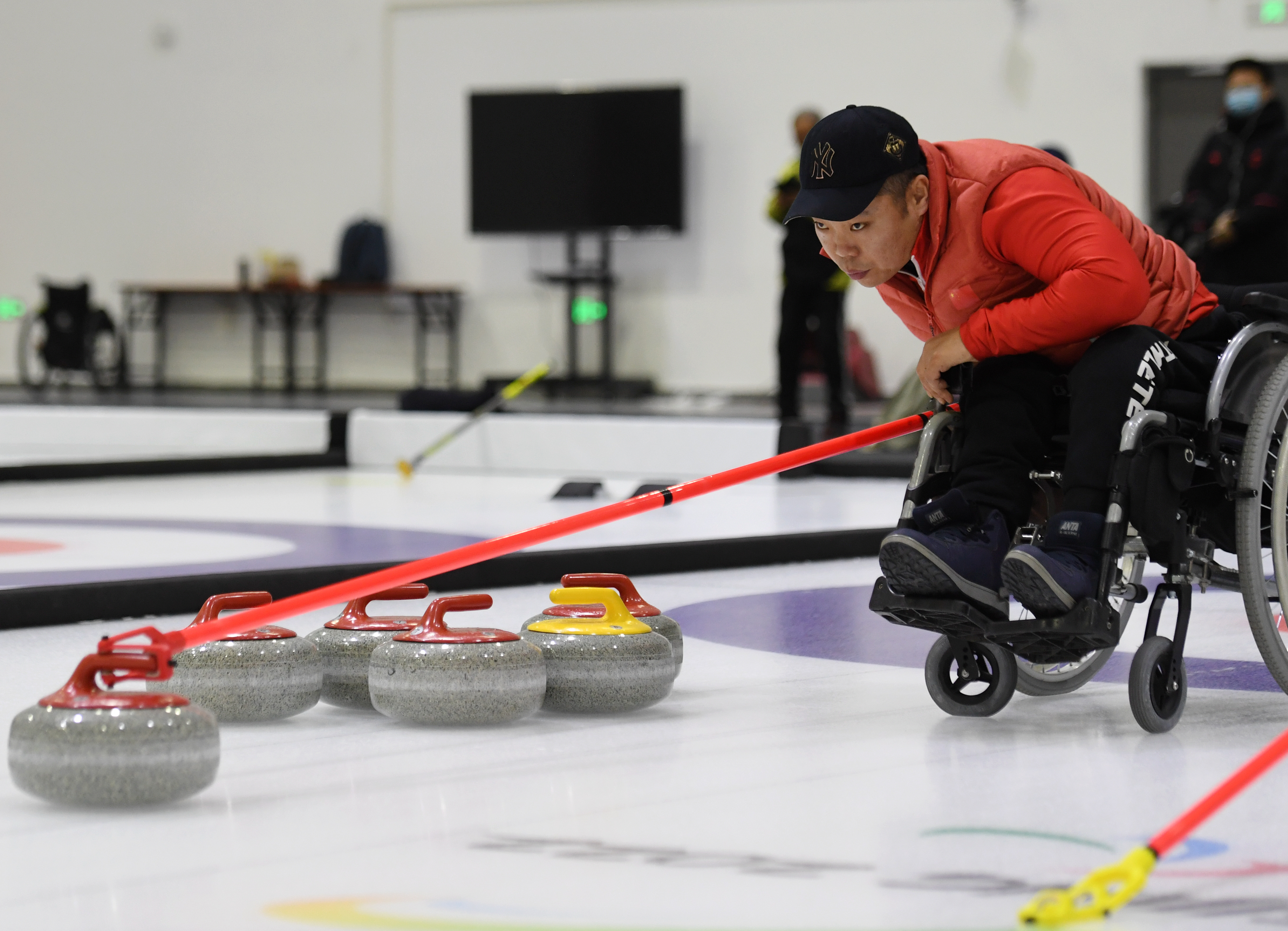 12月24日,国家轮椅冰壶队队员在进行训练。当日,中国国家轮椅冰壶队在国家残疾人冰上运动比赛训练馆轮椅冰壶训练馆进行集训,备战北京2022年冬残奥会。新华社记者 张晨霖 摄