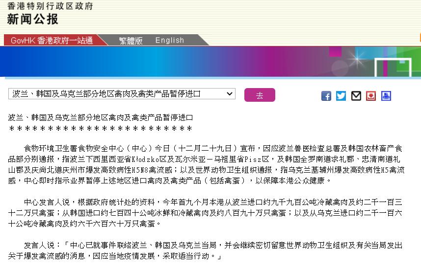 12月29日,香港特区政府食物环境卫生署食物安全中心宣布,由于波兰、韩国部分地区暴发高致病性H5N8禽流感,乌克兰基辅州暴发高致病性H5禽流感,中心指示业界暂停进口相关地区的禽肉及禽类产品(包括禽蛋),以保障香港公众健康。