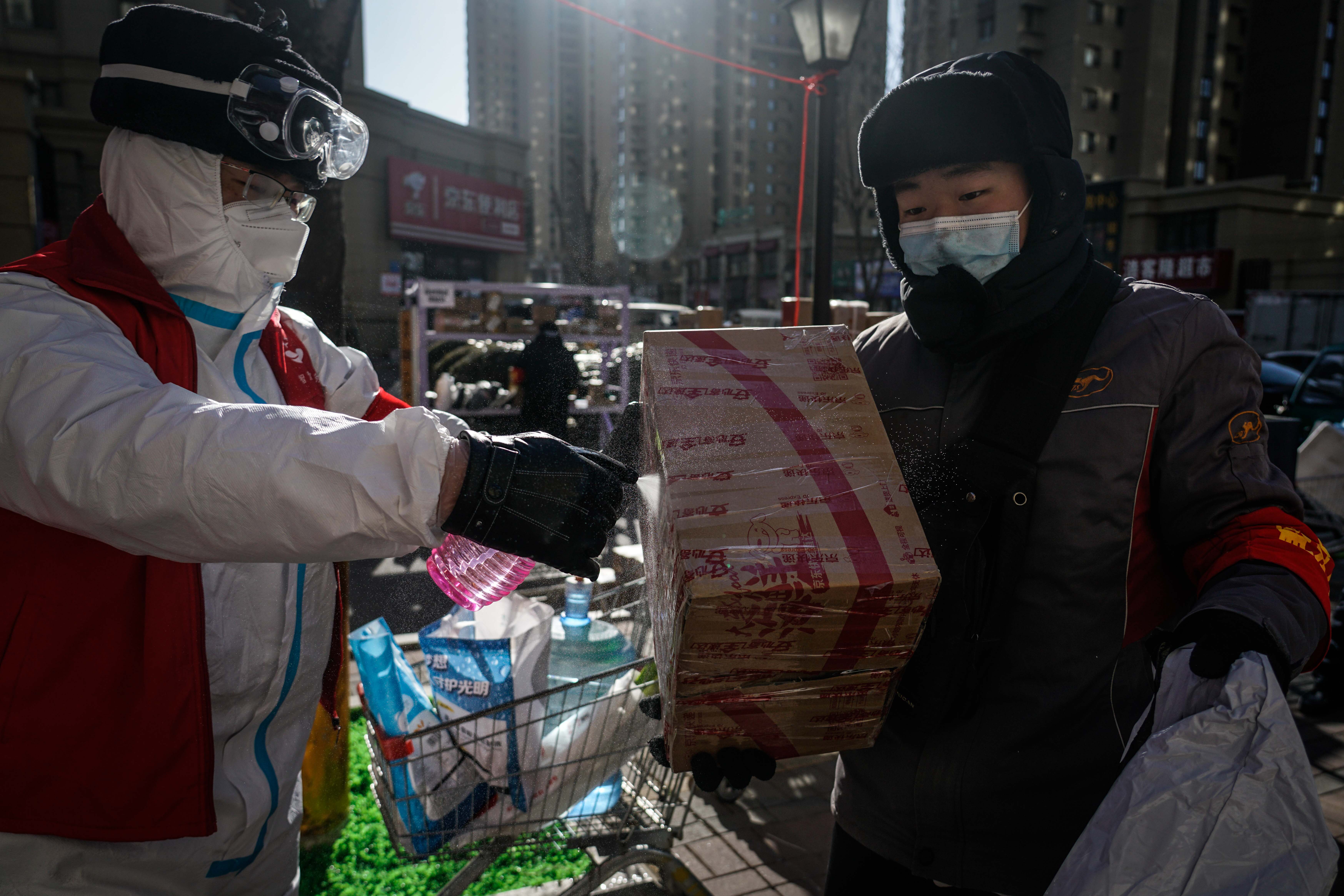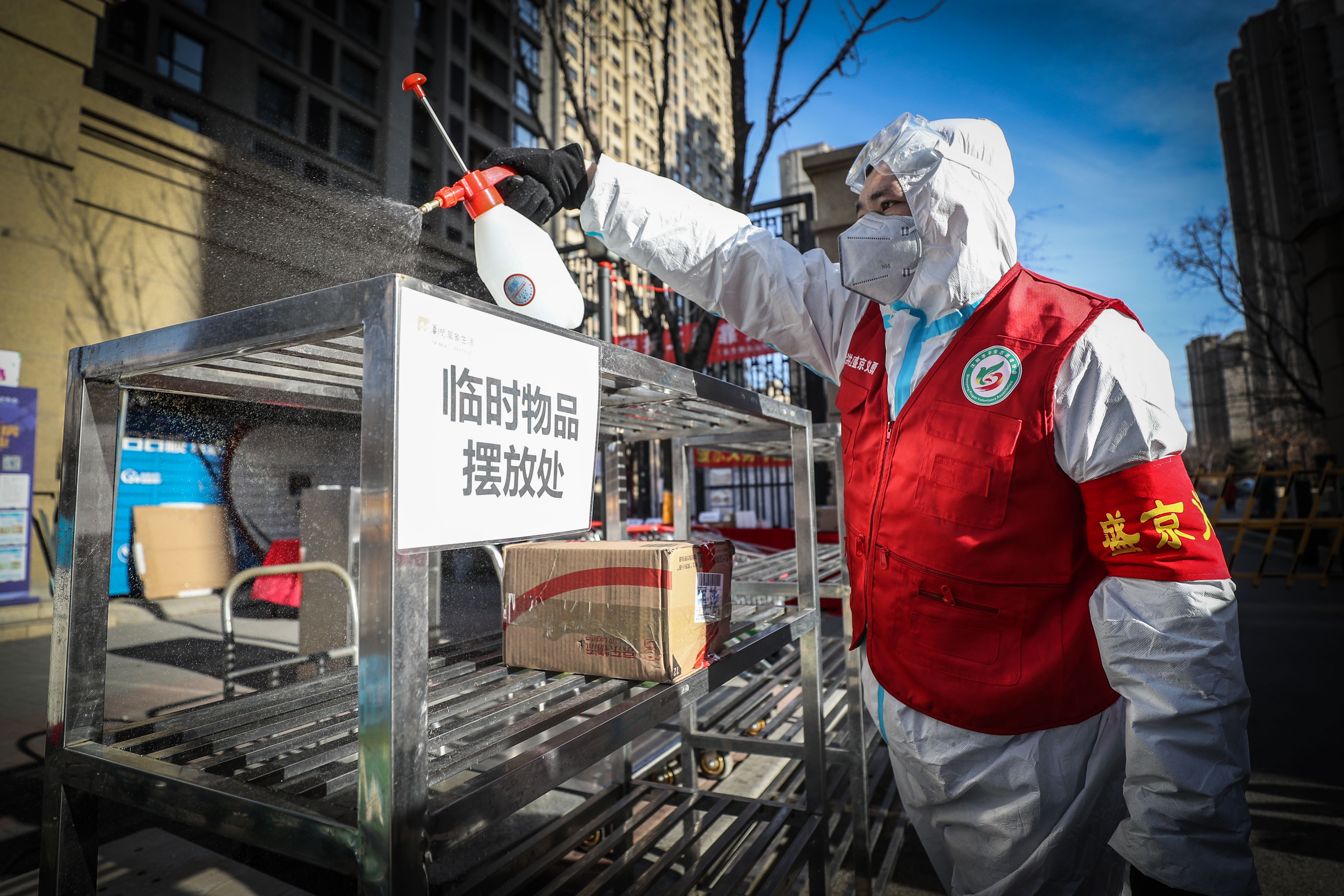 在寒冬里,有“跑腿员”为居家隔离对象送生活必需品,有“巡逻员”在小区周围监控异常情况,有“消毒员”,为小区货架上的快递进行消毒。