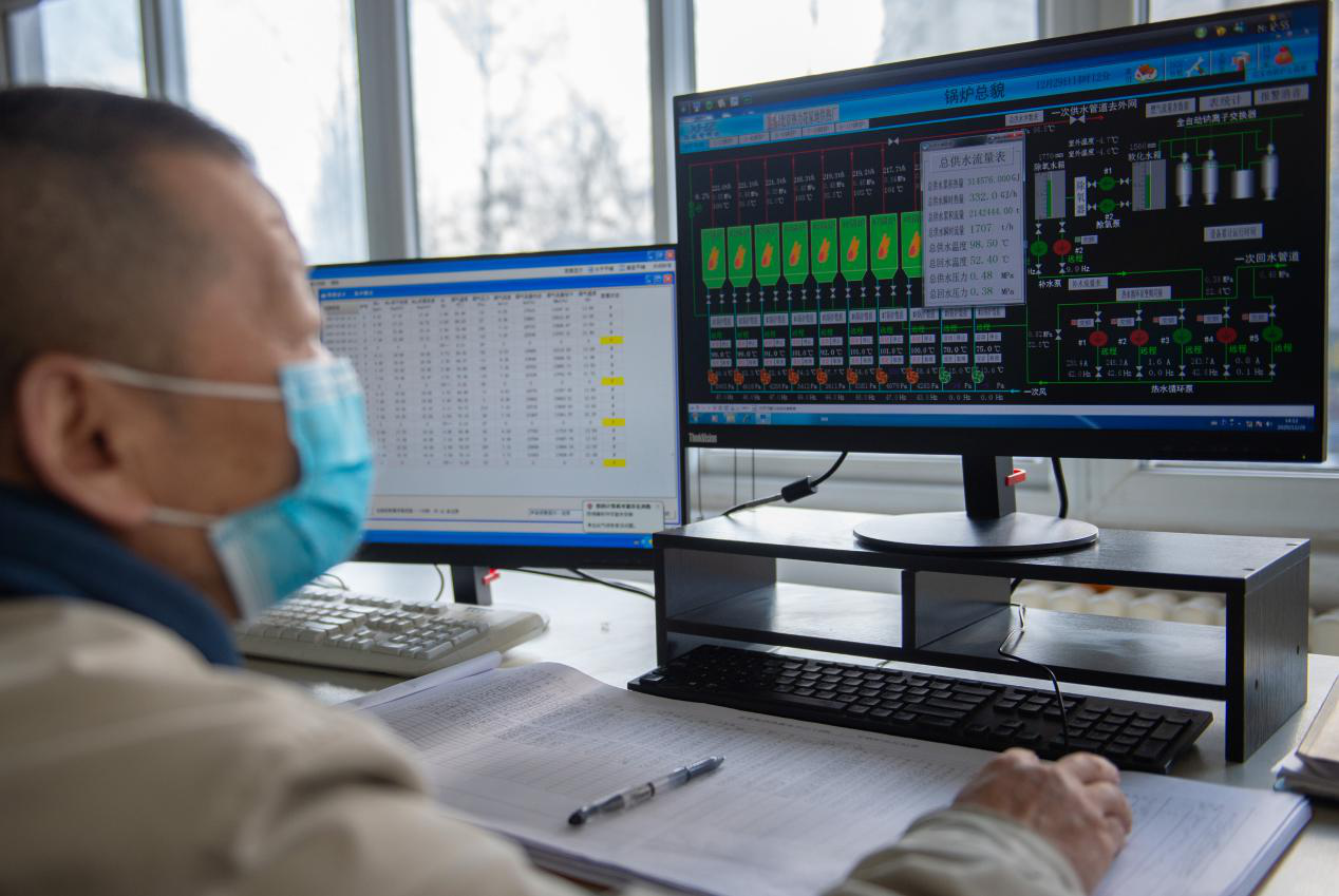 12月29日,北京热力集团朝阳第一分公司望京供热服务站工作人员在中控室监测锅炉数据。新华社记者 陈钟昊 摄