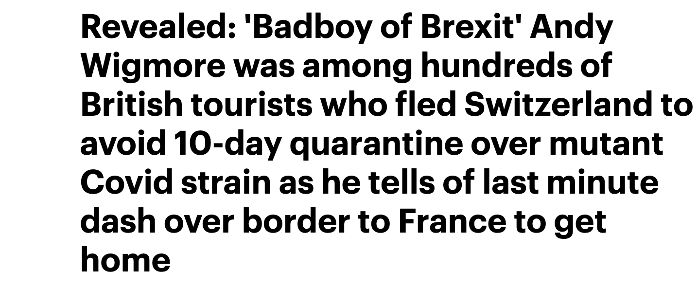 威格摩尔向《每日邮报》透露,当时他正和家人在滑雪场度假,突然收到来自瑞士政府的信息,被告知12月22日将开始进行隔离。