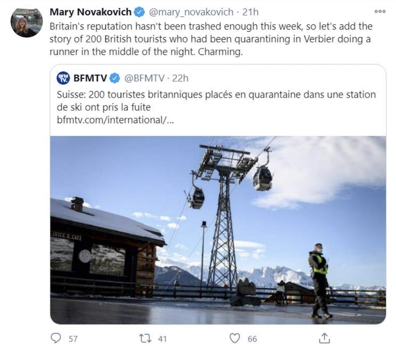 △英国媒体人玛利亚·诺瓦科维奇发文嘲讽逃跑的英国游客