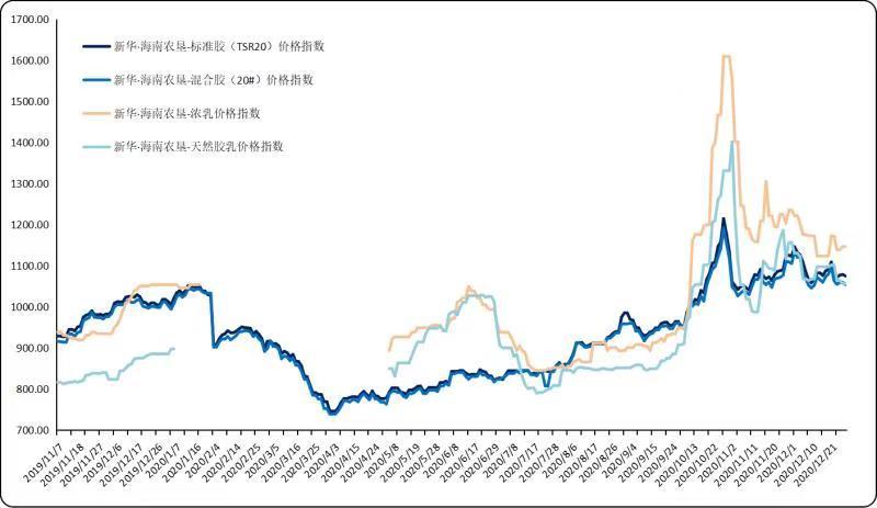 新华·海南农垦-天然橡胶系列价格指数显示,截至12月28日,标准胶(TSR20)价格指数报1074.99点,较12月21日(下同)下跌3.06%;混合胶(20#)价格指数报1054.02点,下跌3.94%;新华·海南农垦-浓乳价格指数报1146.71点,下跌2.2%;新华·海南农垦-天然胶乳价格指数报1056.42点,下跌4.1%。
